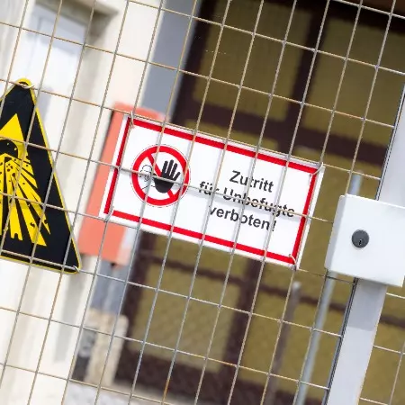 - Bei feststehenden trennenden Schutzeinrichtungen besteht die Schutzwirkung aufgrund einer physischen Begrenzung, die dauerhaft angebracht und optisch gekennzeichnet ist, z.B. ein Schutzzaun.