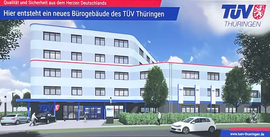 Im Forschungs- und Industriezentrum Erfurt-Südost baut der TÜV Thüringen ein fünfstöckiges Bürogebäude, das auf rund 4.500 Quadratmetern Fläche zur neuen Heimat von über 100 Mitarbeitern des Technischen Überwachungsvereins werden soll. Wichtigster Grund für den Neubau ist das kontinuierliche Wachstum des Unternehmens, denn die parallel zum Dienstleistungs-Portfolio beständig wachsende Belegschaft findet in den bisherigen Gebäuden nicht mehr ausreichend Platz. Die Fertigstellung der neuen Zentrale, in der neben der Verwaltung auch das Herz der bundesweit aktiven TÜV Akademie schlagen wird, ist für Ende 2022 geplant.